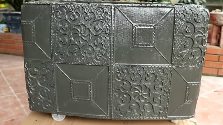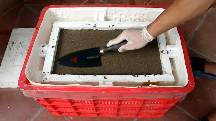 Приклеила к ящику пенопласт и залила цементом. Потрясающая идея для участка