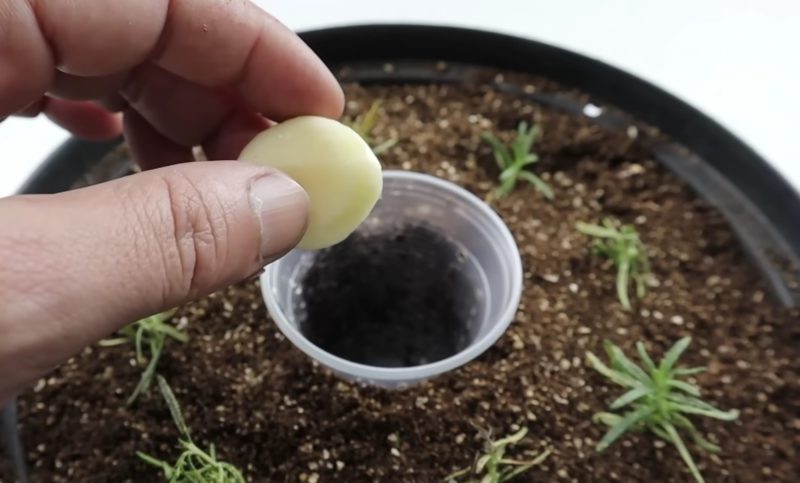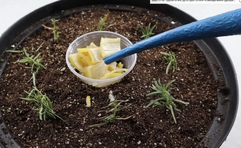 Удобрение из чеснока можно чередовать с удобрением из банановой кожуры, кусочки которой также размещаются внутри пластикового стаканчика.