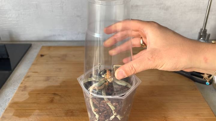Установите стакан поверх орхидеи. Внутри создастся микроклимат, защищающий и восстанавливающий повреждённую орхидею.