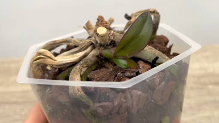 По прошествии недели подсушенной орхидее необходимо создать подходящие условия для наращивания новых листьев. Возьмите пластиковый стакан, в котором сделайте несколько надрезов на дне.