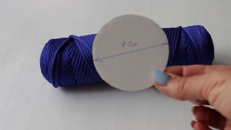 Обмотайте толстый шнур вокруг заготовки из картона диаметром 7 см.