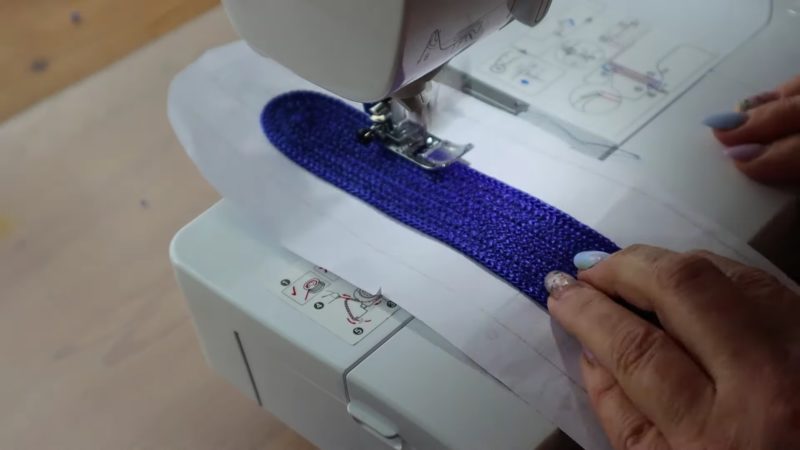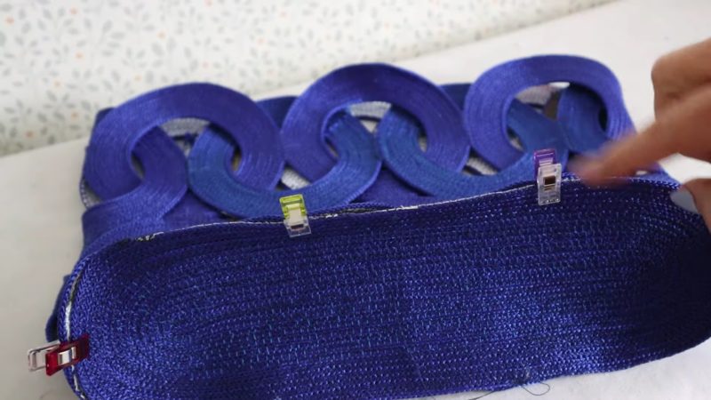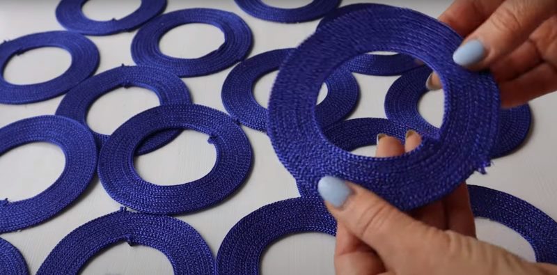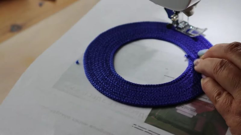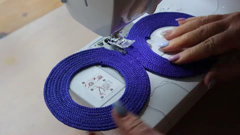 Оставшиеся 12 колец будут вплетаться в основание сумки. Для этого кольца необходимо разрезать и разместить между колец основания. Кольца второго слоя также следует сострочить между собой швом зигзаг, скрывая боковые швы.