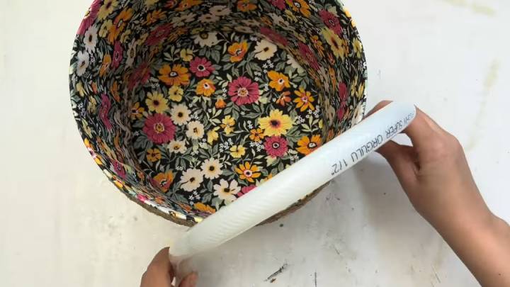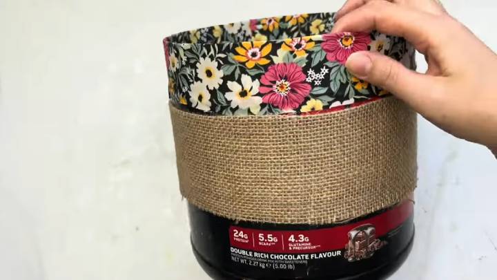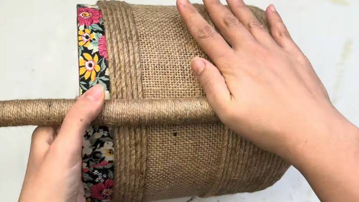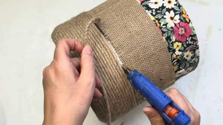 Закройте оставшуюся часть банки джутовым канатом. Его уйдёт не так много, благодаря ткани и мешковине. Второй круг с тканью приклейте снаружи ко дну.