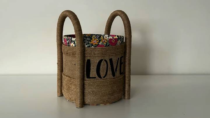 Это шикарная декоративная корзинка, в которой также можно хранить вещи. Невозможно догадаться, что раньше это была ненужная пластиковая банка и садовый шланг!