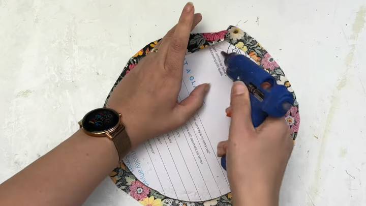 У банки срежьте край, выровняйте. Приклейте ткань, чтобы закрыть внутренние стенки. Также внутрь приклейте один из кругов с тканью, чтобы спрятать дно.