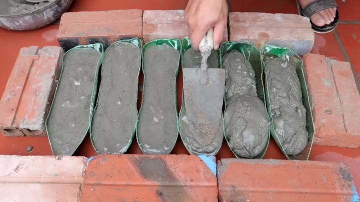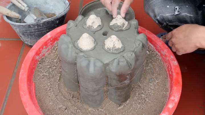 Пластиковые бутылки 1,5 л разрежьте напополам. Вокруг разложите кирпичи. Смешайте цемент с песком в соотношении 1:2. Разведите водой, заполните бутылки.
