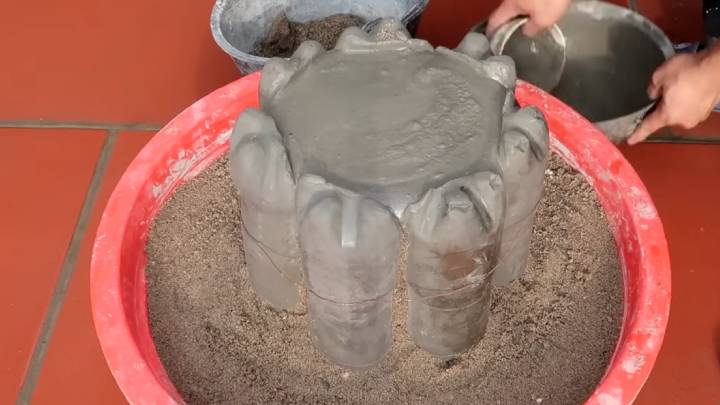 Сделайте дренажное отверстие. Установите самодельные ножки, сделанные из цемента.
