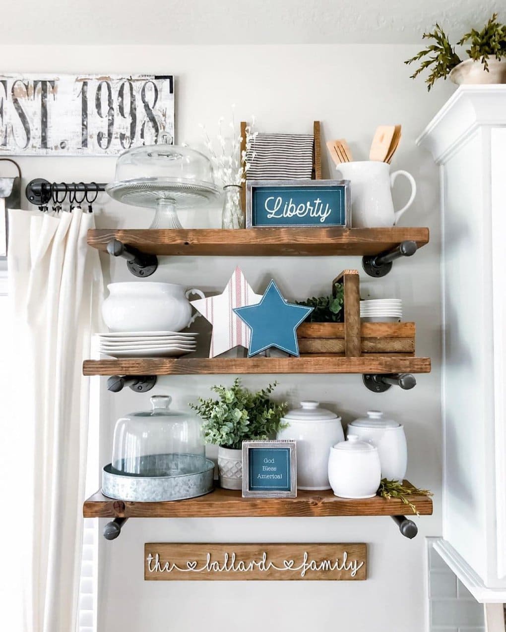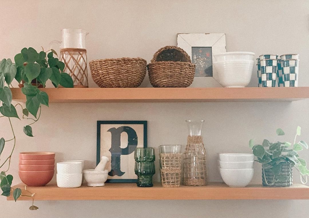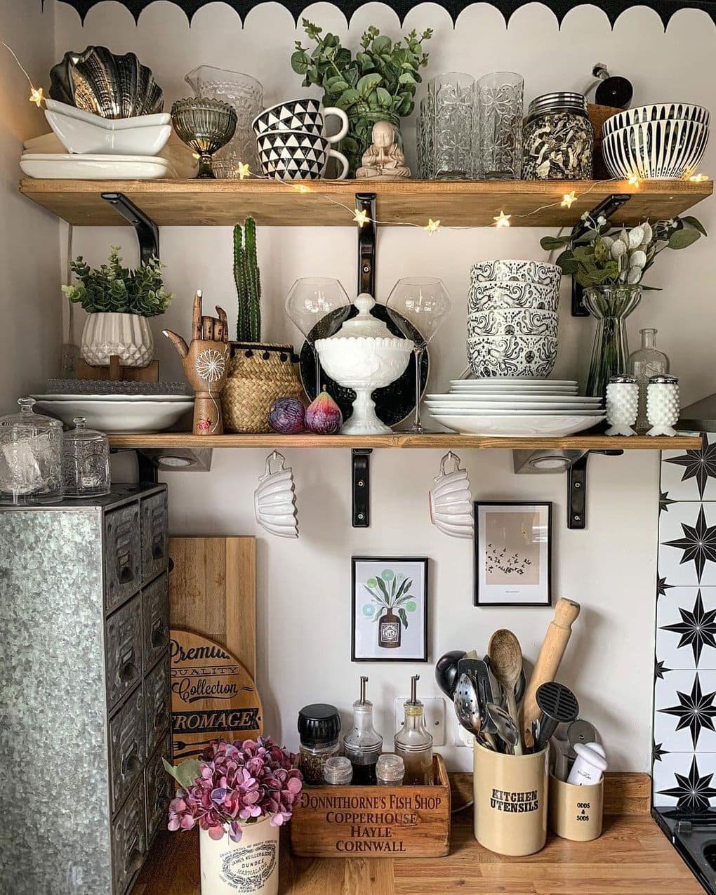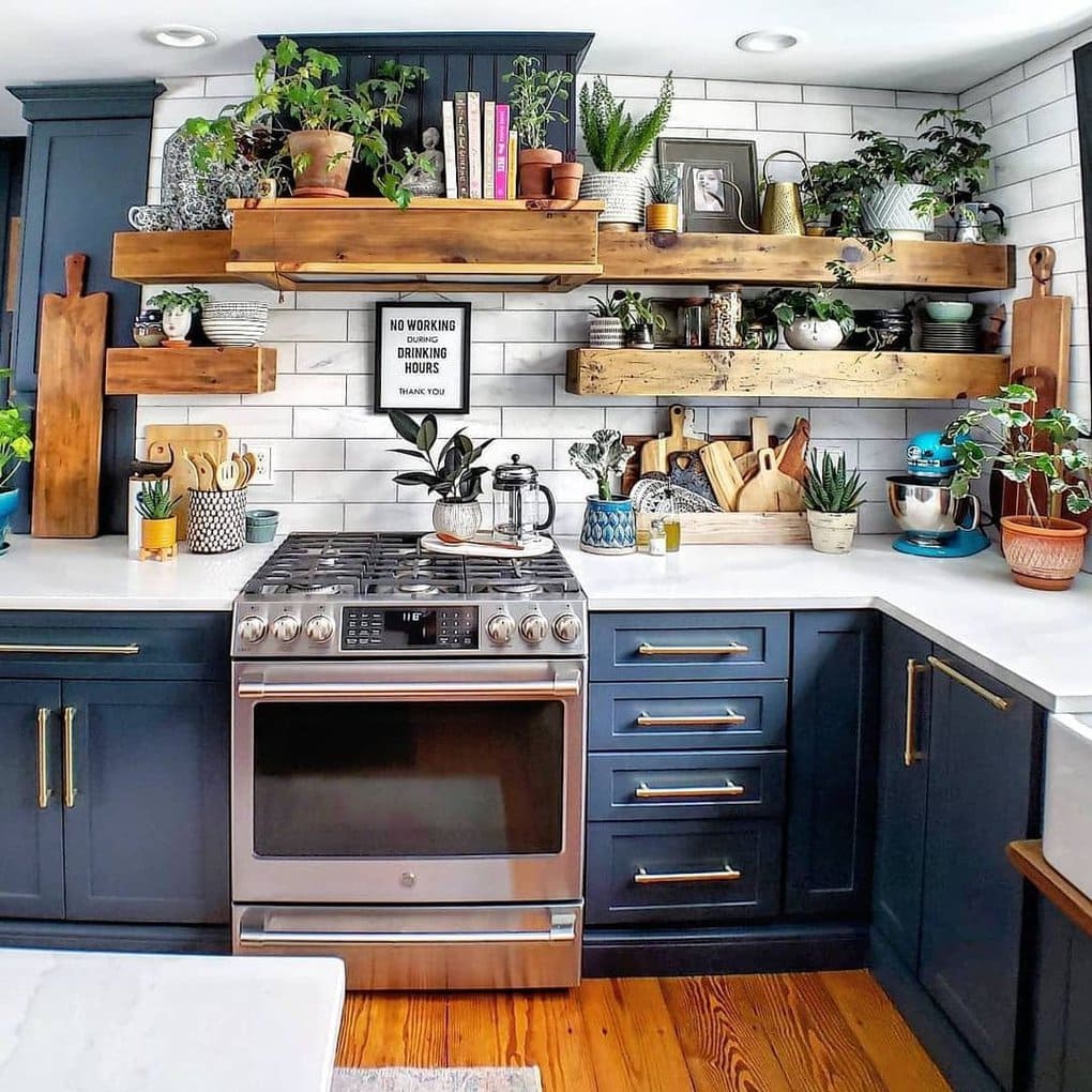При оформлении современных кухонь в разных стилях дизайнеры интерьеров все чаще отказываются от объемных навесных шкафов, которые загромождают пространство, и заменяют их легкими, элегантными, но при этом вместительными и функциональными открытыми полками. Использование такого приема помогает сделать кухню более уютной, светлой и просторной, что особенно актуально для небольших площадей. Если грамотно подойти к организации пространства на кухне, то на открытых полках легко удастся разместить не только всю посуду и кухонную утварь, но и элементы декора и растения, которые добавят «изюминку» в интерьер.