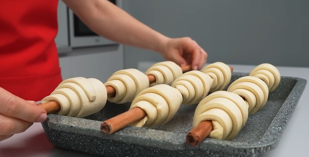 Раскатайте слоеное тесто в прямоугольный пласт и нарежьте на заготовки треугольной формы. Накрутите треугольные кусочки теста на деревянные палочки, придав им форму круассанов.