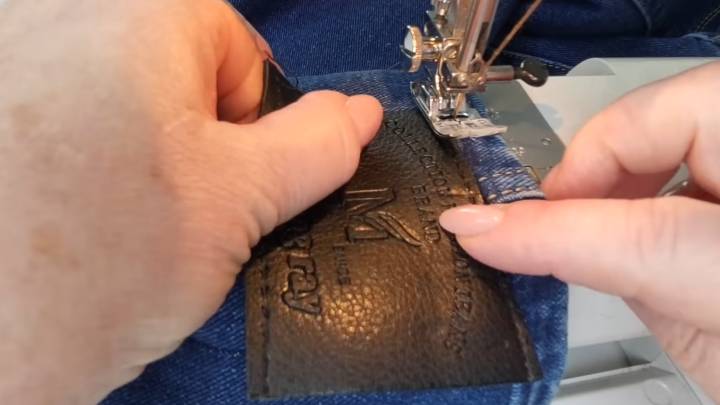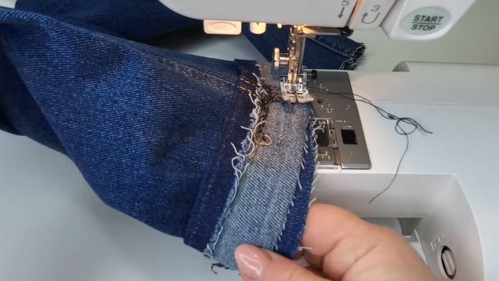 Последний штрих — возвращение фабричного края штанин на место. Распорите ткань, отрежьте лишнюю длину. Совместите края кромки и снова сшейте на машинке в кольцо. Наденьте её поверх штанины. Совместите боковой шов джинсов и кромку. Прошейте на машинке.