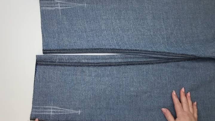 Сложите джинсы по нарисованным отметкам. Прошейте с обеих сторон.