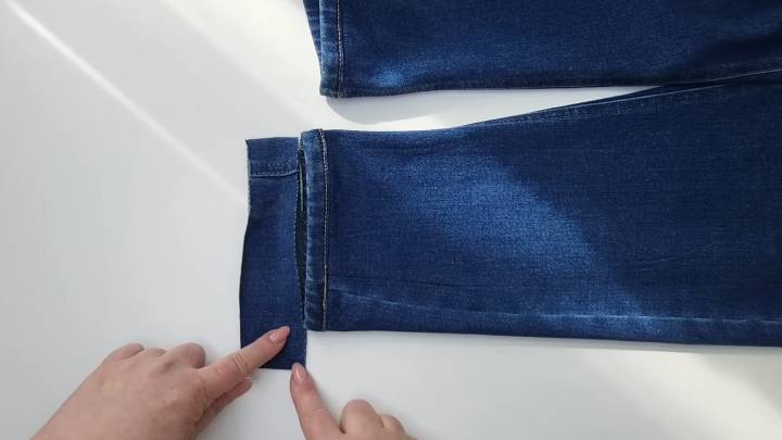 Наденьте джинсы. Подверните по ноге, чтобы было максимально удобно. Заколите булавкой. Снимите, перенесите метку на обе штанины. Отрежьте лишнюю ткань. Фабричный шов также подрежьте. Распорите и раскройте ткань. Пока отложите в сторону.