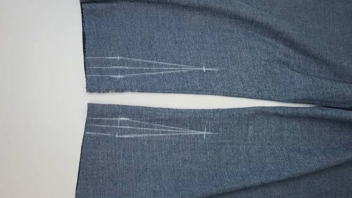 Джинсы выверните наизнанку. Начните с задней стороны штанин. От бокового шва отступите дважды по 3 см на одной и другой штанине. Посередине нарисуйте линию. Продлите её на 20 см вбок. Поставьте отметку.