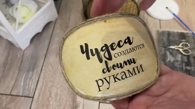 Приклейте выбранную надпись к табличке. Состарить надпись можно с помощью крепкого раствора кофе. Чтобы надпись не стиралась, обработайте ее слоем акрилового лака. Оформите табличку веревкой, проделайте в ней два отверстия и закрепите на корзине.