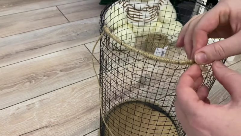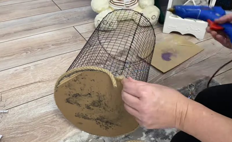 Для окрашивания основания корзины и сетки используйте черную аэрозольную краску. Чтобы место соединения сетки с дном выглядело более аккуратно, задекорируйте его с помощью джутового каната.