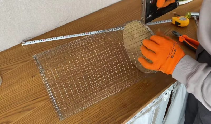 Используя кусачки, подготовьте отрез сетки необходимой высоты и ширины. Края сетки соедините с помощью медной проволоки. Для крепления сетки ко дну используйте промышленный степлер.