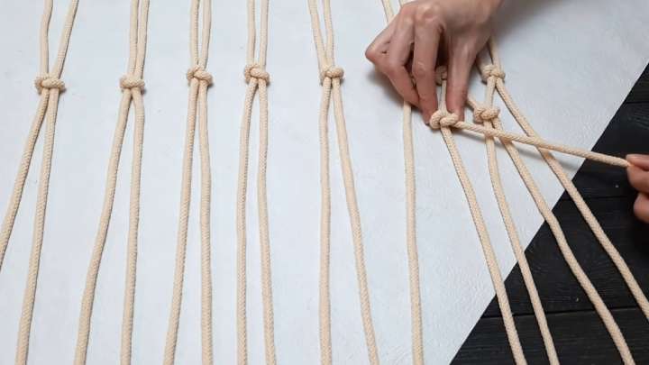 Чтобы перейти на следующий ряд, отступите пару сантиметров и свяжите галстучным узлом уже две другие соседние верёвки. Получится шахматное плетение.