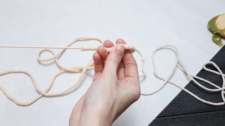 Для удобства верёвку можно перекинуть через книгу или папку. Тогда плести ряды можно будет удобнее, быстрее и ровнее.