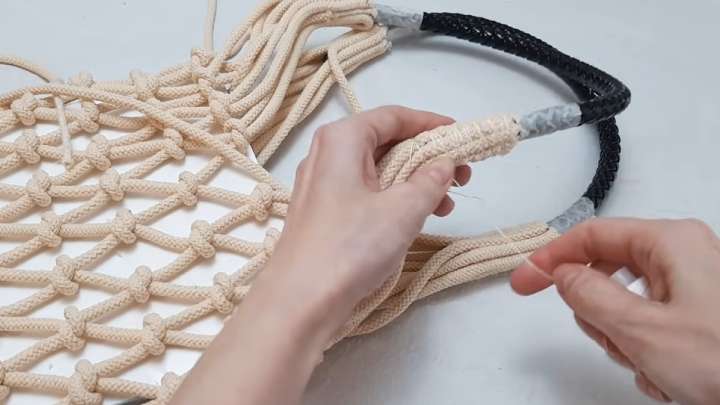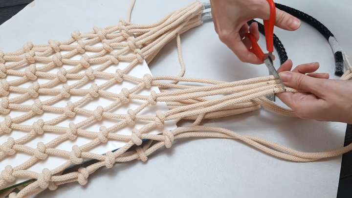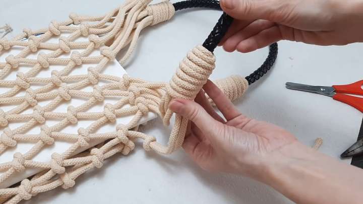 Сплетите достаточно рядов, чтобы сверху осталось по 8 узлов с одной стороны без смещения в бок. Отмерьте купленную ручку, отрежьте лишнее. Также отмерьте 14 см верёвки, всё остальное отрежьте, оставив только 1 верёвку длинной.