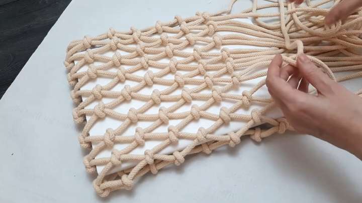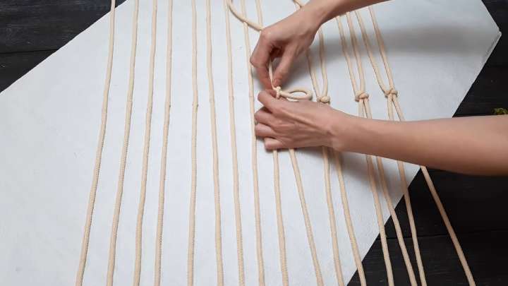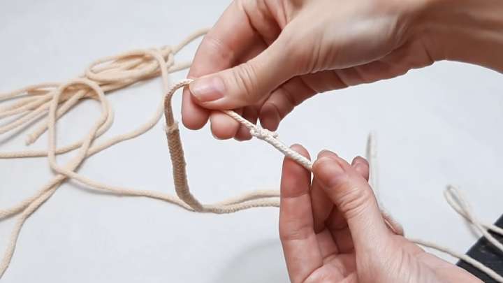 Ровно по центру перекрутите две рядом располагающиеся верёвки галстучным узлом (макраме).