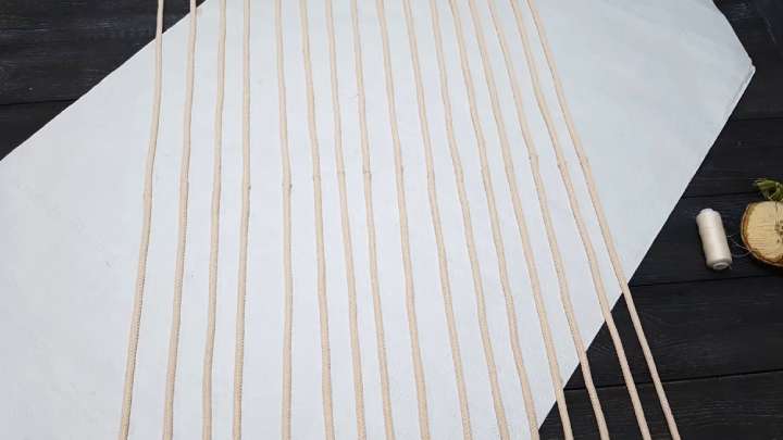 Вам понадобится 16 верёвок по 2,5 м. Разложите их параллельно друг другу на рабочей поверхности.