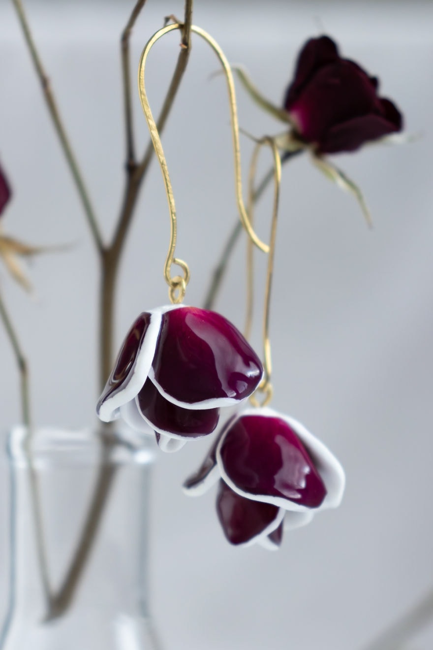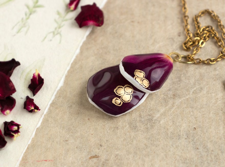 Украшения, вдохновленные красотой одних из самых прекрасных цветов — роз, не оставят никого равнодушным. Скажем больше, для создания таких дизайнерских украшений талантливая мастерица Светлана из России, использует лепестки живых цветов. Она засушивает лепестки, а затем обрабатывает их особым образом, в результате получая уникальные серьги, колье, браслеты и кольца.