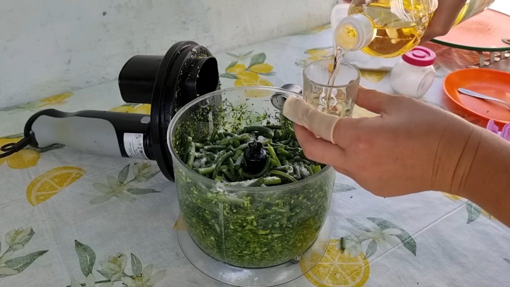 Для приготовления пасты из чесночных стрелок можно использовать либо блендер, либо мясорубку. Поместите в блендер чесночные стрелки, укроп, растительное масло, соль и лимонную кислоту. Измельчите все ингредиенты в блендере до получения пасты.