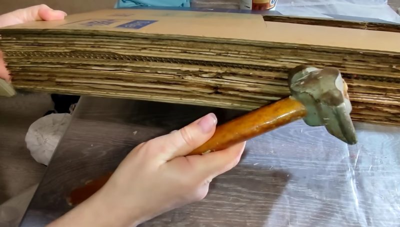 Выровняйте боковые части столика с помощью молотка, для этого просто аккуратно отбейте картон.