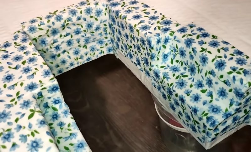 Для выравнивания поверхности обклейте заготовку сначала тонкими бумажными салфетками, а затем листами формата А4. После полного высыхания клея оформите столик тонкой тканью.