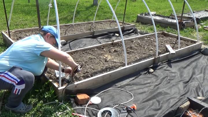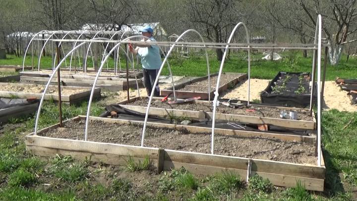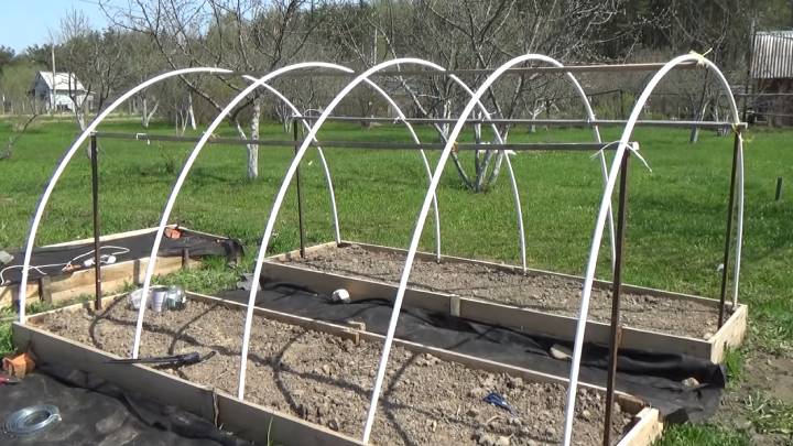 Дуги можно приобрести готовые, а можно просто воткнуть в землю с одной и другой стороны двух грядок трубы для холодной воды по 4 м каждая. Подойдут полипропиленовые, ПВХ или металлопластиковые разновидности.