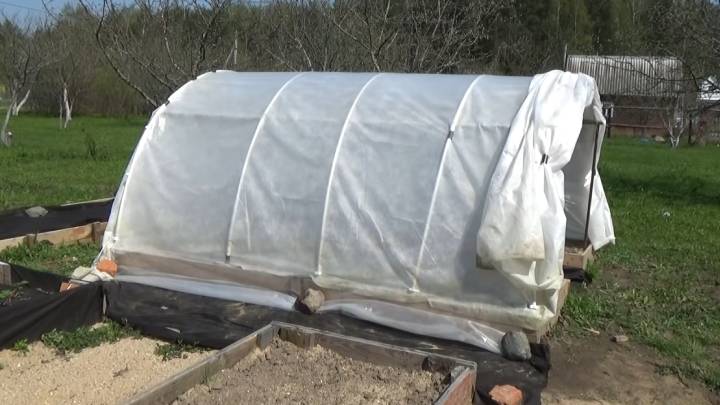 Укройте её спанбондом и плёнкой. По бокам положите камни или кирпичи, чтобы зафиксировать. В конце сезона укрывной материал можно снять, почистить и убрать до следующего года. Такая простая тепличка будет эффективно защищать растения от ветра, сильного солнца, морозов и вредителей!