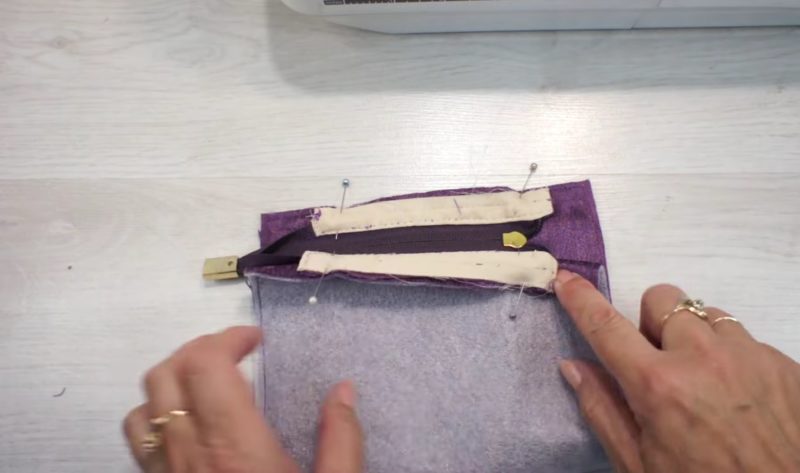 Пришейте молнию к узким деталям из основной ткани. Когда молния будет вшита, пришейте к заготовке узкие детали из подкладочной ткани. Выверните заготовку с молнией на лицевую сторону. Проутюжьте деталь, короткие края подверните, сколите портновскими иголками и проложите фиксирующие строчки по краям и вдоль молнии.