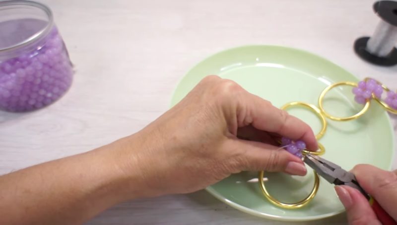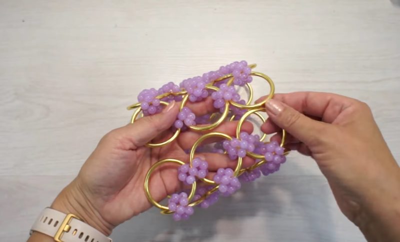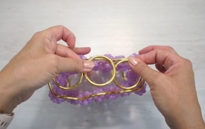 Разместите бусины на всех стыках колец. Скрепите три цепочки бусин между собой и замкните заготовку в кольцо.
