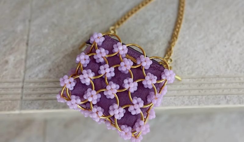 Готовую сумочку разместите внутри основания из колец. Прикрепите металлическую ручку, и стильный аксессуар, который привлечет к себе внимание, будет готов.