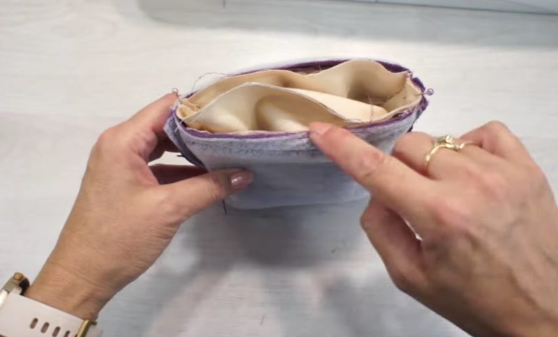 Подготовьте заготовку для изготовления подкладки. Прокладывая фиксирующие строчки по боковым швам, оставьте небольшой участок для выворачивания на лицевую сторону незастроченным. Соедините подкладку и верхнюю часть сумочки. Выверните изделие на лицевую сторону через отверстие в подкладке. Застрочите отверстие в подкладке. По верхнему краю сумочки проложите отделочную строчку.