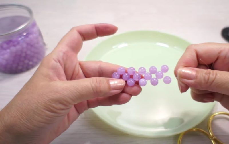 - наденьте одну бусину на левый конец проволоки, а вторую на правый, в результате получится дорожка из 15 бусин.