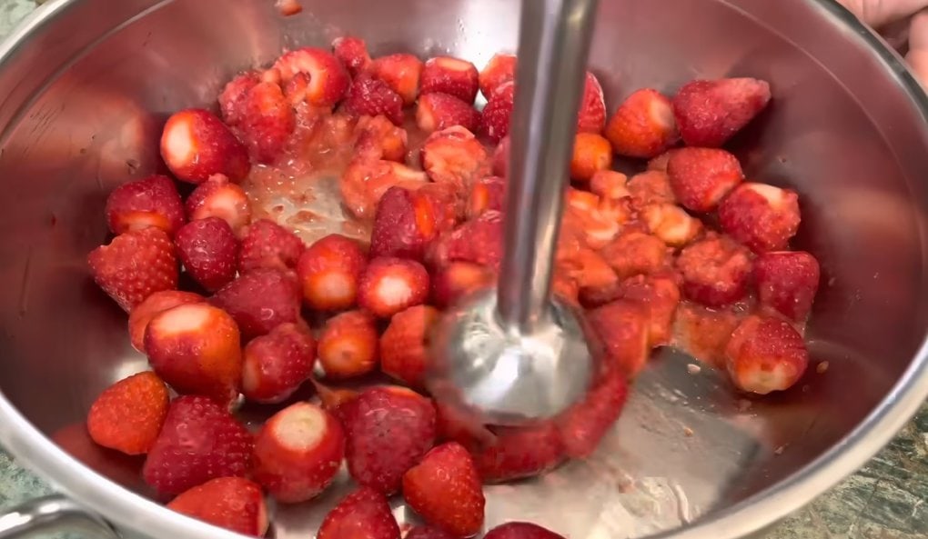 Используя погружной блендер, превратите мягкую клубнику в однородное пюре.