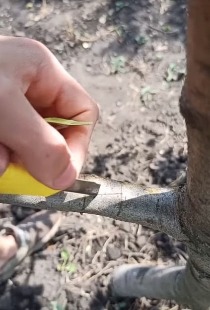 На веточке груши, на которую будет осуществляться прививка яблони, сделайте два вертикальных и один горизонтальный надрез.