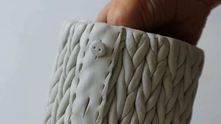 Также из пасты отрежьте кусочек, раскатайте в тонкий пласт, приклейте к банке. Ножом сделайте отверстия как под швы. Из пасты скатайте шарики, расплющьте, приклейте и сделайте отверстия, как на пуговице.