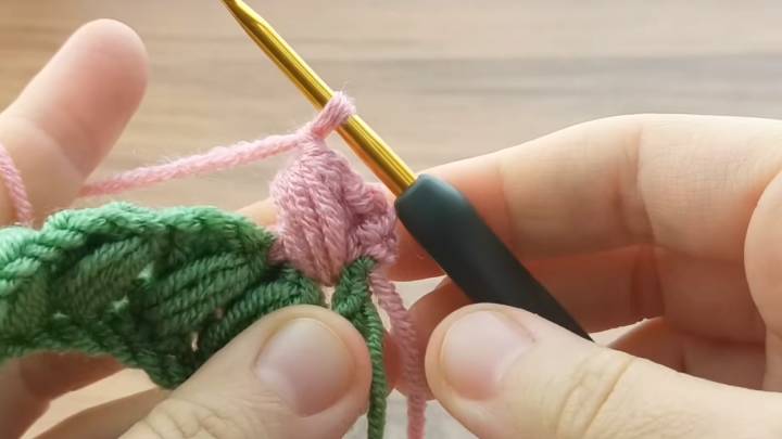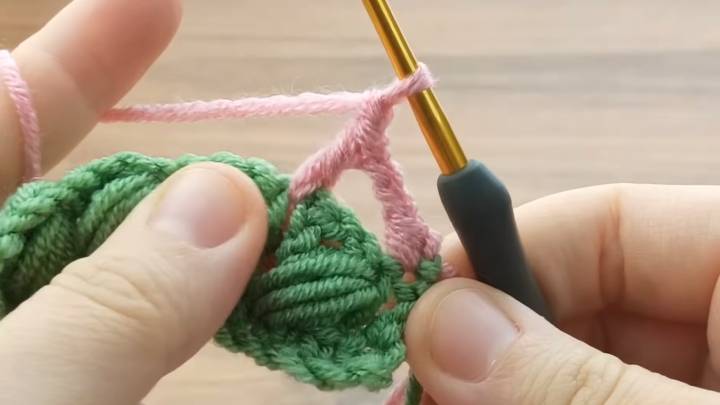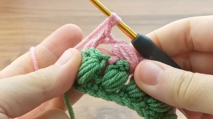 Поменяйте цвет нити. Новой пряжей также поднимитесь на 2 ВП, сделайте накид. Пропустите первый промежуток между ССН и пышным столбиком в предыдущем ряду, свяжите 1 ССН в следующий промежуток между столбиками.