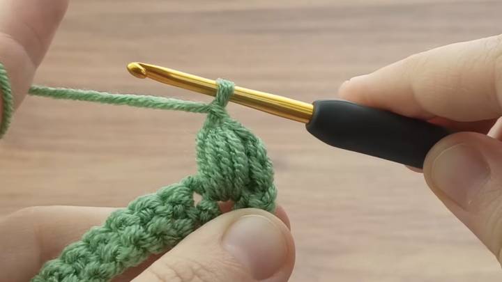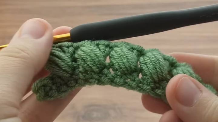 Затем снова накид и пропуск следующей петли в ряду. Провяжите через одну петлю 1 ССН. Снова накид, вернитесь в предыдущую петлю, вытяните пряжу, и так 4 раза. Сделайте ещё один пышный столбик. Как можно заметить, благодаря пропуску и возвращению столбики «смотрят» влево. Провяжите так до конца ряда. В конце, в последнюю петлю, просто провяжите 1 ССН.