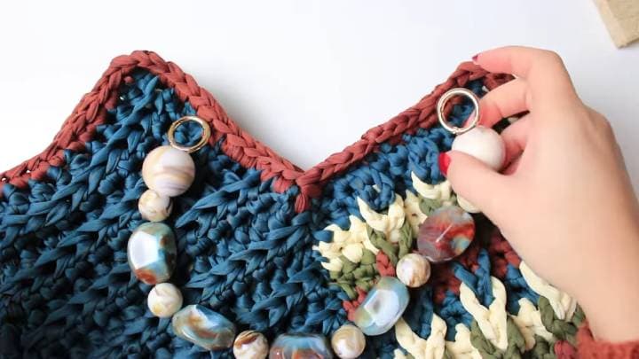 Обвяжите край сумки столбиками без накида в один ряд. Подберите ручки, зафиксируйте.