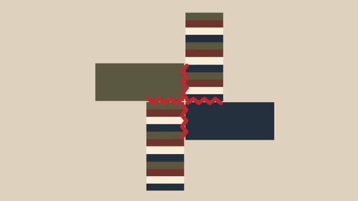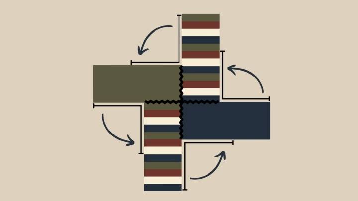 Когда 4 прямоугольника будут связаны, начинаем собирать сумку! Для этого сложите заготовки, как показано на фото. Процесс сборки более понятен, если взглянуть на схему (см. ниже). Теперь необходимо сшить вручную места соприкосновения прямоугольников (отмечены красным). Это дно сумки.