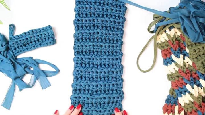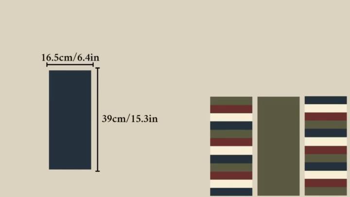 Размер прямоугольника — 16,5*39 см. В зависимости от толщины вашей пряжи и размера крючка понадобится разное количество петель и рядов. Свяжите образец и замерьте, соответствует ли ширина 16,5 см. Цветовую гамму также подбирайте самостоятельно.