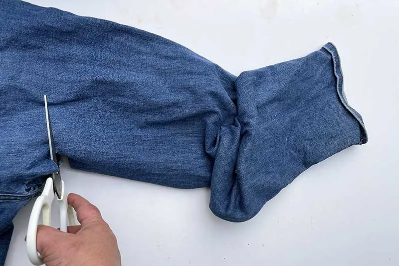 Отрежьте штанины джинсов в верхней части бедра, чуть ниже карманов. Также отрежьте нижний край джинсов.