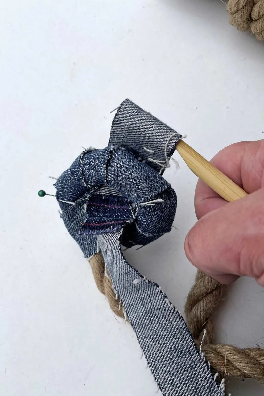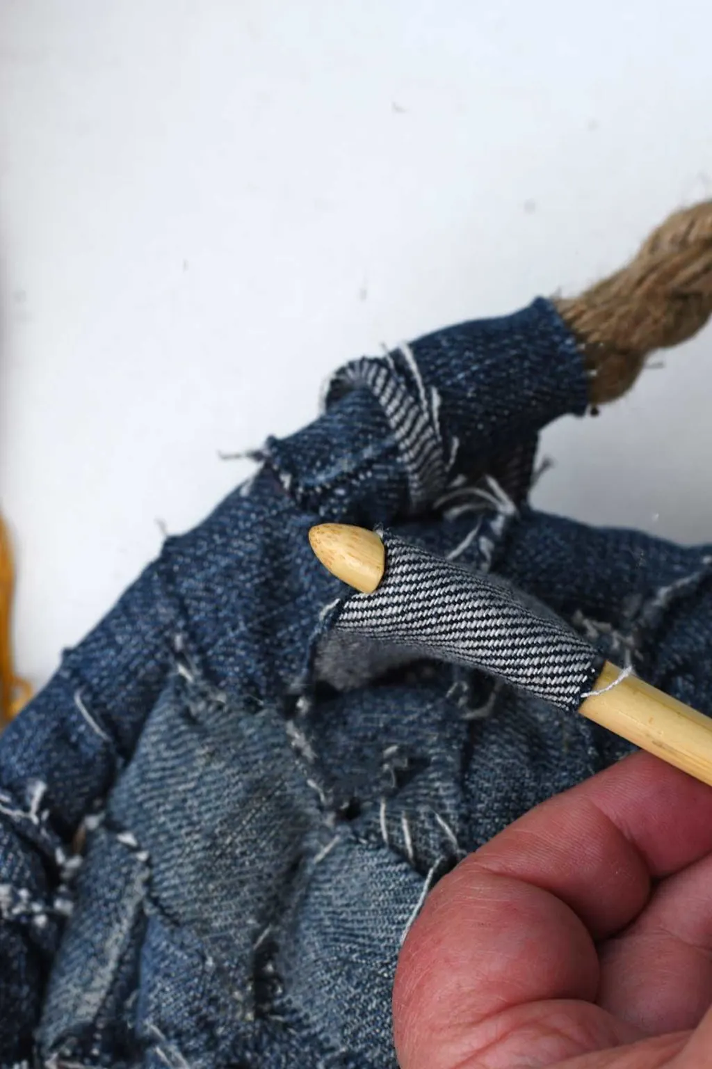 Закрутите обмотанную часть веревки в плотный жгут. С помощью крючка протяните конец джинсовой пряжи через середину заготовки.