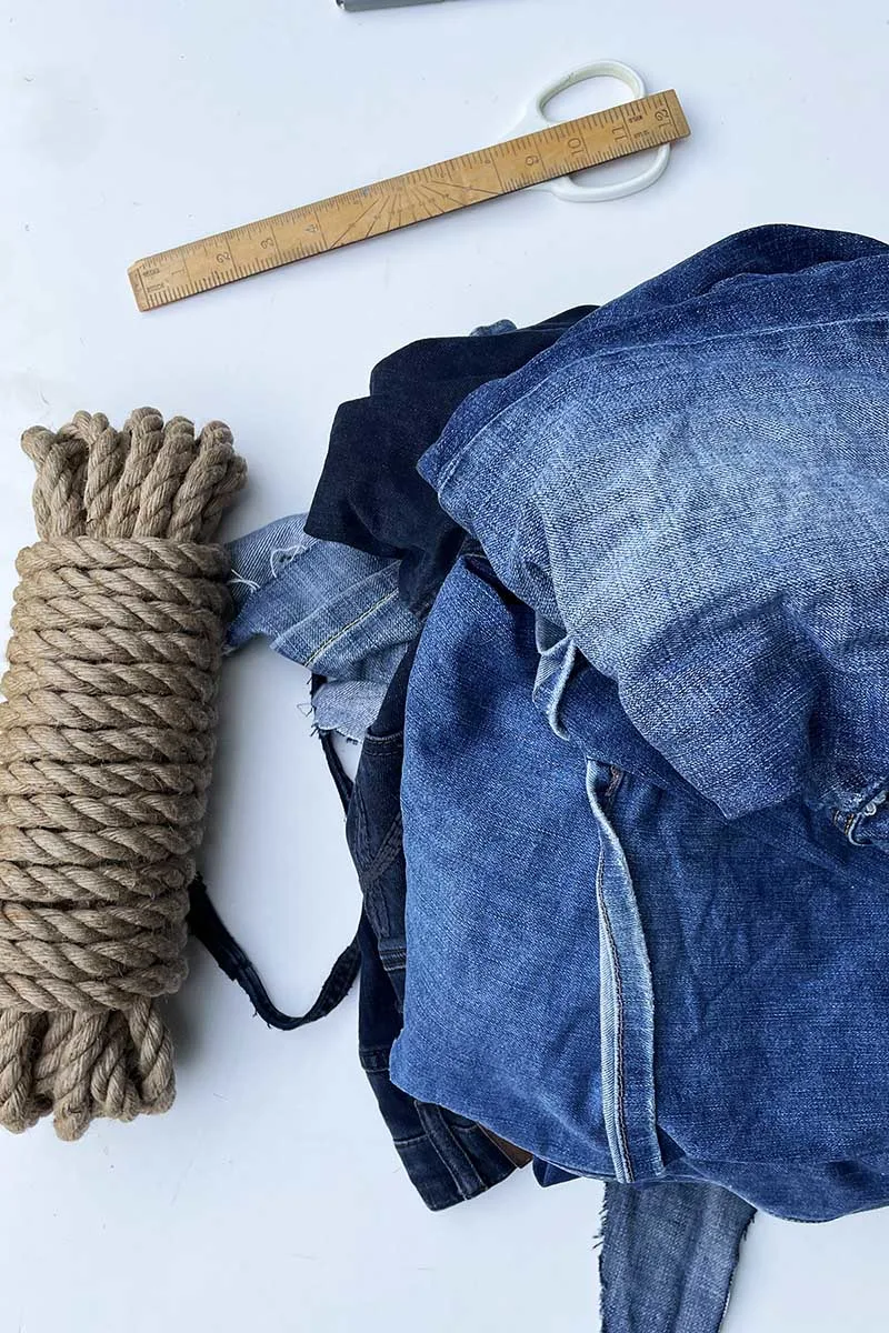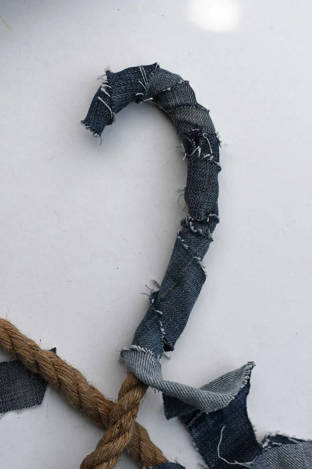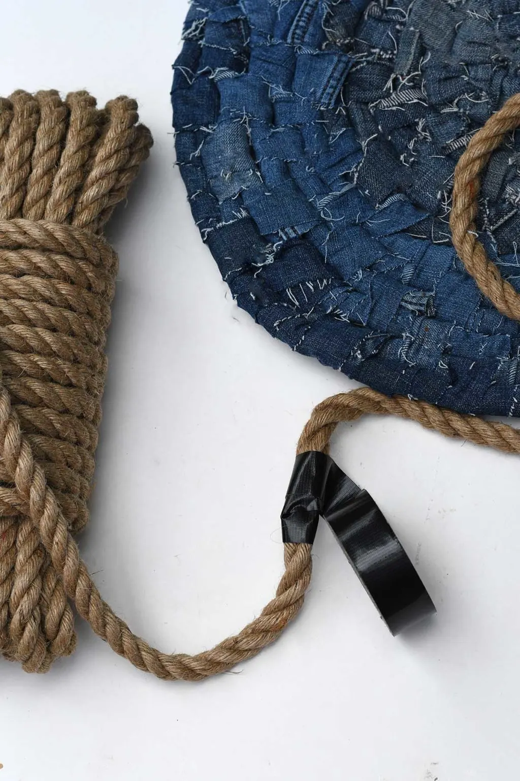 Если закончилась веревка, присоедините новый отрез с помощью клейкой ленты. Места соединения будут завернуты в джинсовую ткань, и их не будет видно.