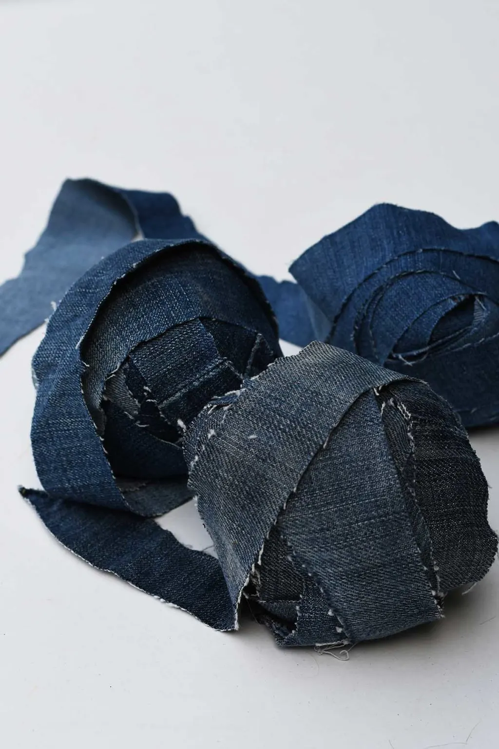 В результате получится длинная полоса джинсовой пряжи, которую необходимо свернуть в клубок для дальнейшей работы. Для создания коврика потребуется минимум восемь таких клубков.