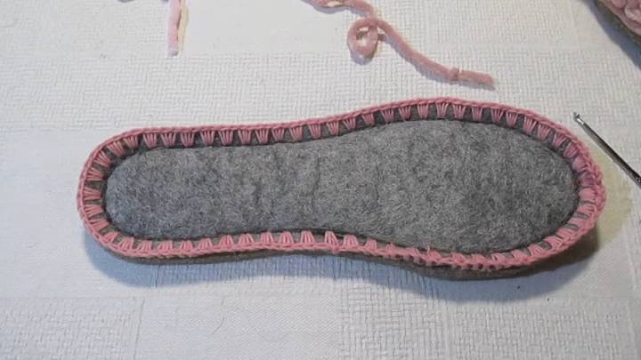 Прикрепитесь сбоку стельки, провяжите 1 столбик без накида простой, не плюшевой пряжей. Затем в каждое отверстие вяжите по 2 столбика без накида. Только на носке 3 центральных отверстия провяжите по 3 столбика без накида.