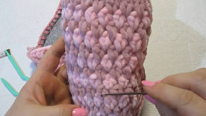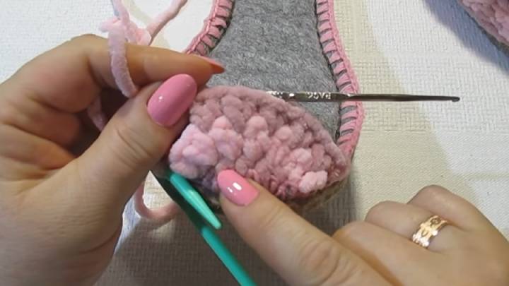 Теперь нужно придать изделию завершённый вид. Для этого следует обвязать стельку и закрыть начальный ряд петель. Выведите плюшевую пряжу на лицевую сторону и через одну петлю обвяжите по кругу соединительными столбиками.